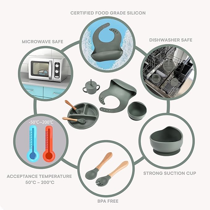 - Our baby feeding set is made of 100% high-quality food-grade silicone, making it safe for your baby to use. It is unbreakable, high-temperature resistant, and microwave-safe, so you can safely heat up your baby's food without any worry.