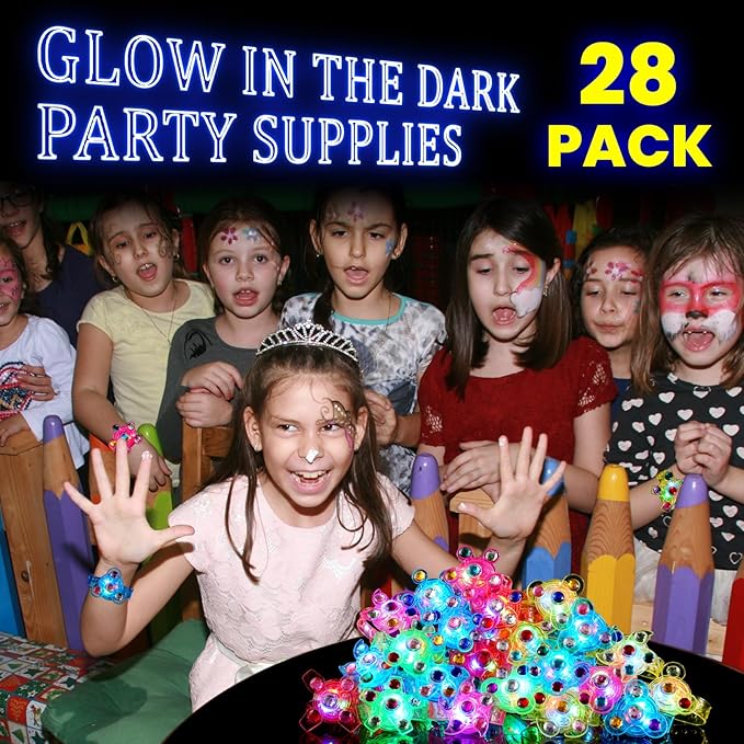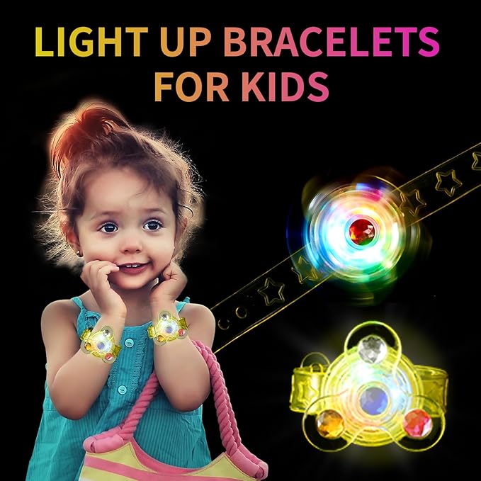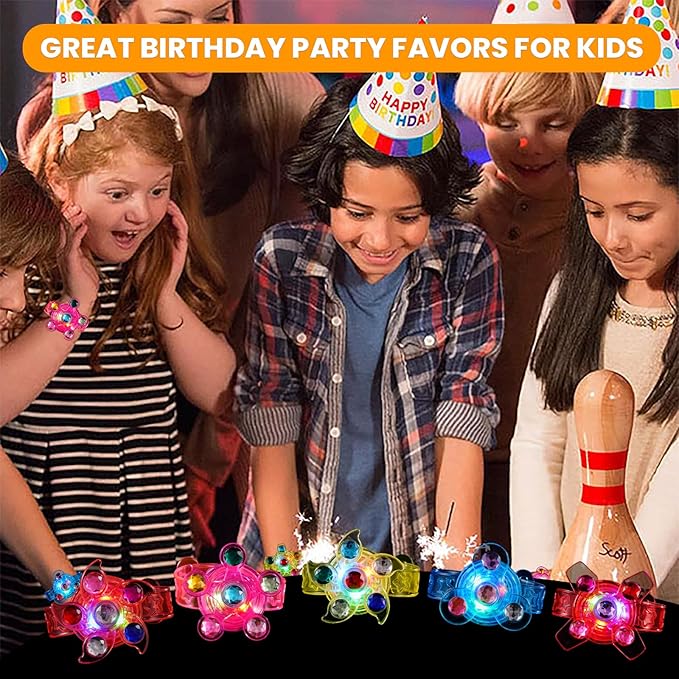 - Party Favors for Kids 8-12 - Kids are always focused and attracted by the colorful flashing lights. These kids birthday party favors comes with 28 pack light up bracelets. Multiple random colors and various styles, our glow in the dark party supplies combine kids bracelet, led lights and spinner toy all of which are loved by kids. Great party favors for kids 8-12, fun to play with your friends and family.