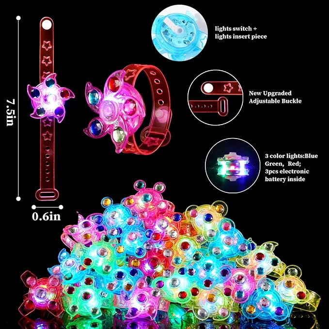 - Birthday Party Favors - The wrist buckle are made of soft plastic and close firmly, which won't loose when the children playing with light up braceletes. New upgraded adjustable buckle design is suitable for wrists of different thicknesses, possible to be worn by both adults and children. Bright enough to catch the eye of children, LED lights can last a long time. You can even use these kids party favors without lights to fiddle with and use them as a fidget toy during the day.