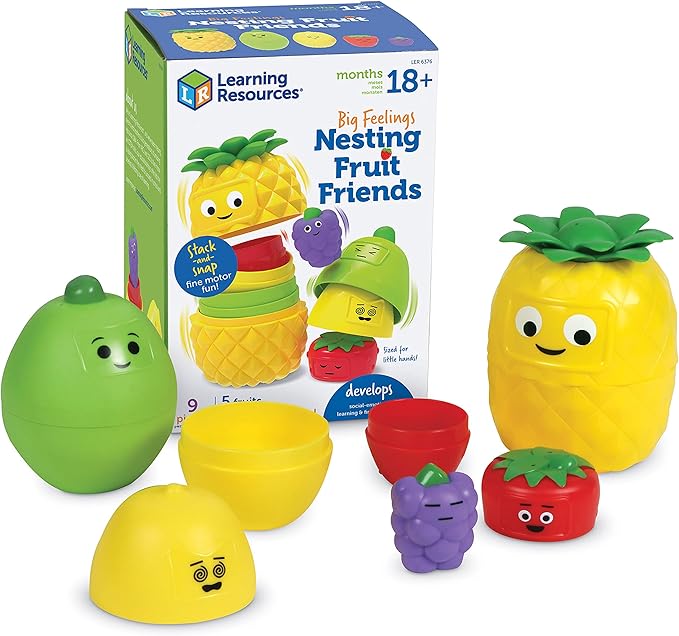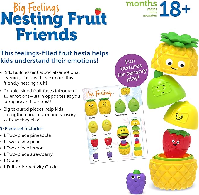 - Ages and Stages: Specially designed with little ones in mind, the Big Feelings Nesting Fruit Friends help kids as young as 18 months build essential SEL skills!