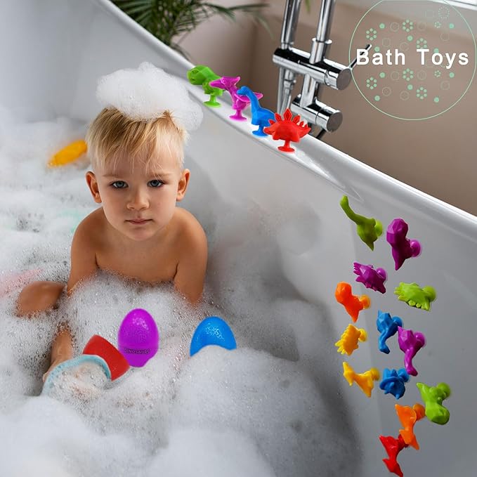 - 🦕Suction Cup Fun- Our Dinosaurs Easter Eggs come with suction cup bases, sticking to smooth surfaces. transforming bath time into a creative and engaging experience. But the fun doesn't end there – The vibrant egg shells not only serve as color matching bowls, enhancing cognitive skills, but also cleverly double up as a perfect storage solution when closed.