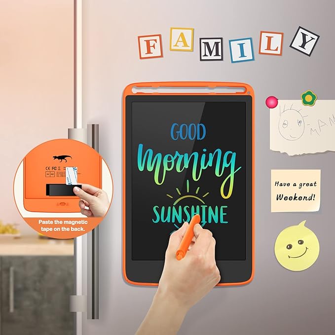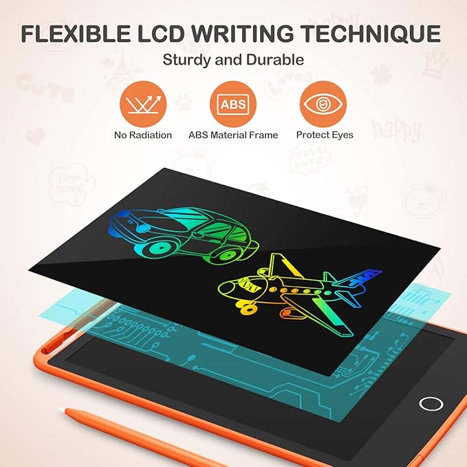 - Portable for Kids Road Trip: The 8.5-inch kids drawing tablet weights 4.55 oz for you easily carry it in a backpack, schoolbag, briefcase; The toy is very suitable for children aged 3-8 years to use for airplane, car activities, road travel. Lock Function: Slide the lock button on the back of the writing tablet to prevent accidental clearing, protect your creation! Press the erase button to clean the screen.