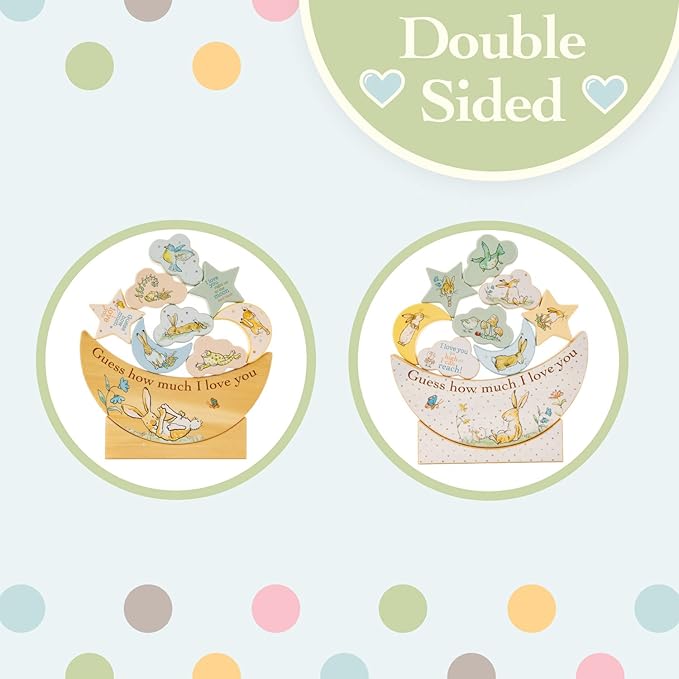 - Stacking Playset: Stack fun shapes like stars, clouds, and moons each featuring characters and quotes from the classic children's book Guess How Much I Love You.