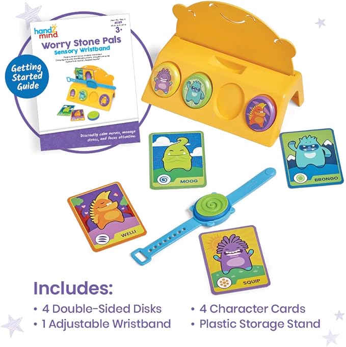 - QUIET FIDGET TOYS FOR KIDS 3-5: Children can practice social emotional learning throughout the day with Worry Stone Pals! This set includes 4 double-sided Worry Stone Pals, 4 Worry Stone Character Cards, an Adjustable Wristband, a Display Stand, and a Getting Started Guide.