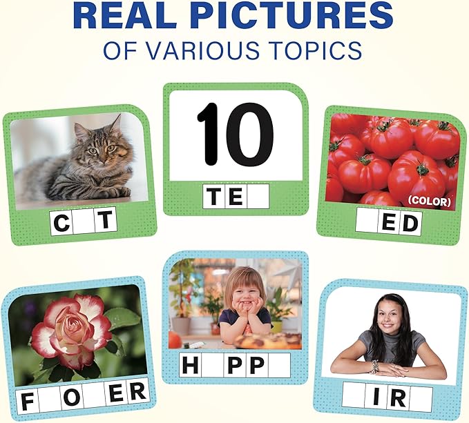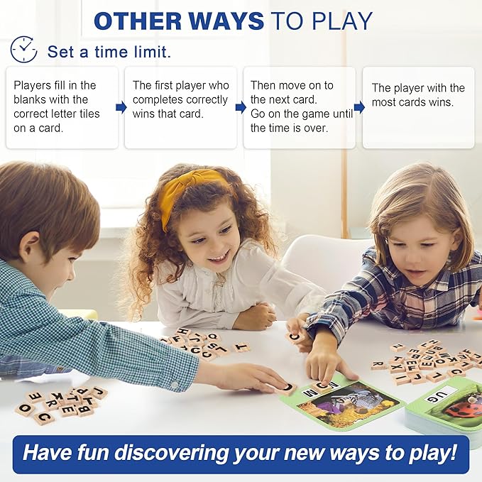 - HIGH QUALITY & SAFE: Double-sided spelling cards; durable laminated cardstock; Cards are 4.7 x 4.35 inches, rounded corners, built to last; Wood letter tiles are smooth-sanded natural wood, odor-free, non-toxic water-based paint, safe for elementary kids