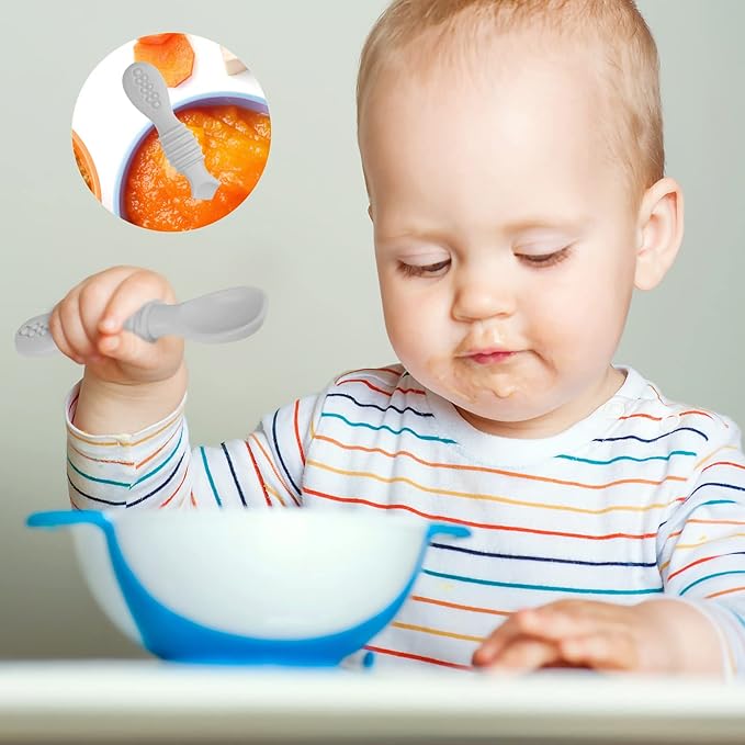 - Product Includes: 4pcs silicone baby spoons in grey. Educational figure and interesting design are easy to catch baby's attention, and enough for them to eat soft food.