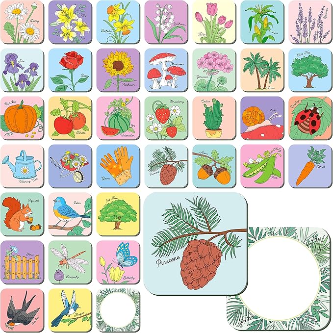 - Including 72 PCS MATCHING CARDS: Total 72 cards make it 36 pairs for kids to get familiar with garden planting. Double-sided design makes you have different ways to play. One side printed with vibrant patterns, another side is blank, you can draw pictures you want on it and make a new game with your imagination. Each card measures 2” X 2”.
