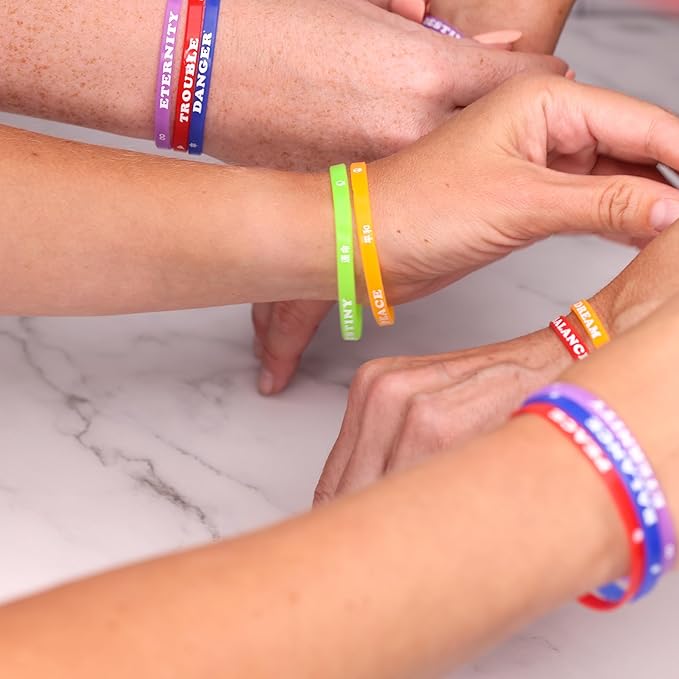 - Silicone bracelet bulk gifts for kids come in bright 5 colors: green, red, blue, orange and purple. Silicone bracelets for kids have 12 different words on them. NOT for kids under 3 years old