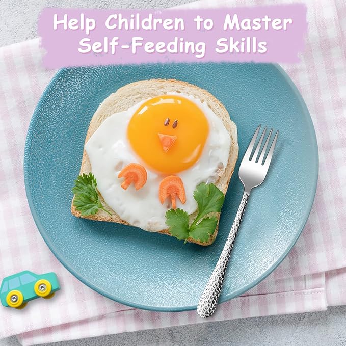 - EASY TO SELF-FEED: This kids forks set with hammered handle design looks like adult utensil, Give a feel of independence to kids, Mini size fit for kids small hands, Help kids learn how to eat quicker and effortless