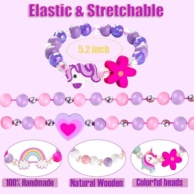 - HANDMADE NATURAL MATERIAL : All the bracelets are made of the natural wooden beads charms by handmade with non-toxic and odorless water-soluble paint. The bracelets are safe and durable passed the CPSC test. Light weight and fillet design are more friendly and comfortable for toddlers kids daily wear. Bright colors and cute patterns are super lovely and sweet for little princess girl.