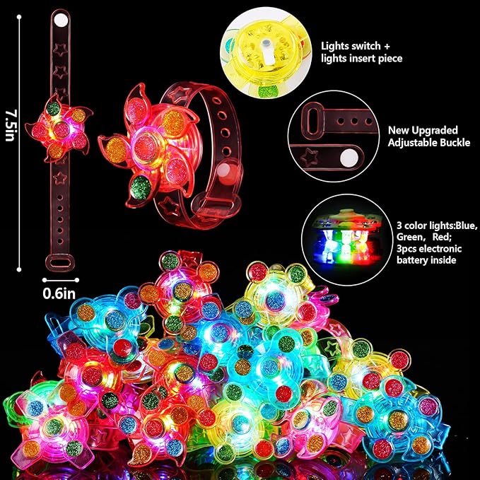 - Classroom Exchange Prizes - The wrist buckle are made of soft plastic and close firmly, which won't loose when the children playing with light up bracelets. New upgraded adjustable buckle design is suitable for wrists of different thicknesses, possible to be worn by both adults and kids. Bright enough to catch the eye of kids, LED lights can last a long time. You can even use these fidget bracelets for kids without lights to fiddle with and use them as a fidget toy during the day.