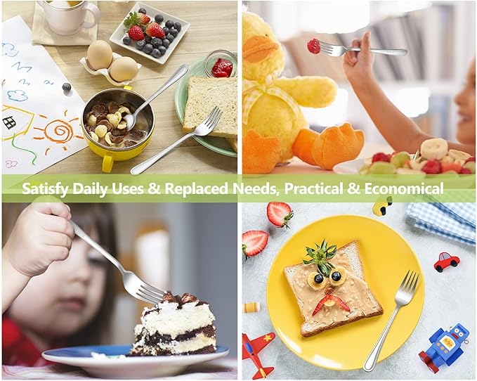 - KID FRIENDLY DESIGN – Smaller and smooth fork tines without any rough spots for easier to fork appropriate amount of food at a time by kids themselves, Smooth mirror surface prevents scratching hands or mouth, Parents can rest assured kids self-feeding