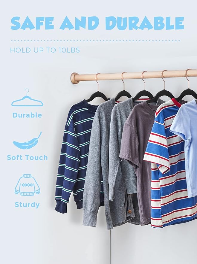 - Non Slip Small Velvet Hangers: Unlike plastic or metal hangers, the velvet child hangers made of luxurious velvet and improved high-grade ABS plastic, can hold up to 10 lbs; These childrens hangers for clothes will hold even the heavy coats or jeans securely in your kid's closet, making your baby room decor more elegant and tidy