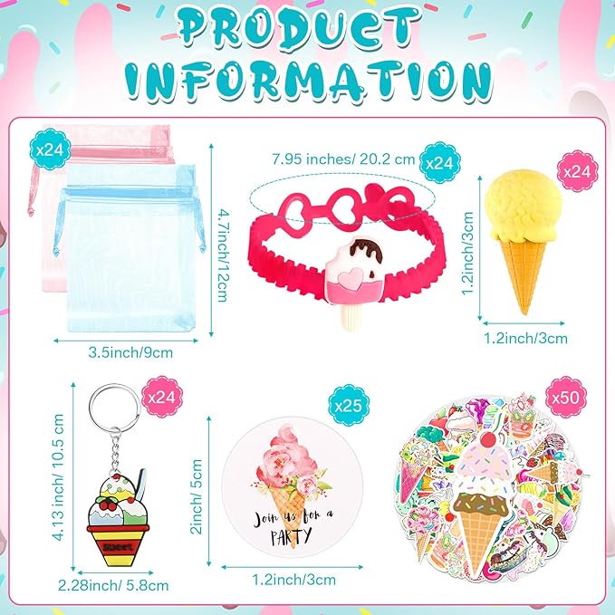 - Ice Cream Party Supplies: the package includes 25 ice cream labels, 24 ice cream erasers, 24 organza bags, 24 ice cream keychains, 24 ice cream bracelets, 50 ice cream stickers, 171 pieces in total, such a nice and complete combination that can satisfy your various needs for an ice cream themed party