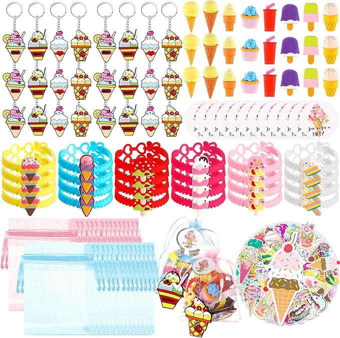 Thenshop 171 Pcs Ice Cream Party Favors Ice Cream Bracelet Keychain Eraser Sticker Labels Organza Gift Bags for Kids Girls Summer Baby Shower Ice Cream Theme Birthday Party Decorations Supplies