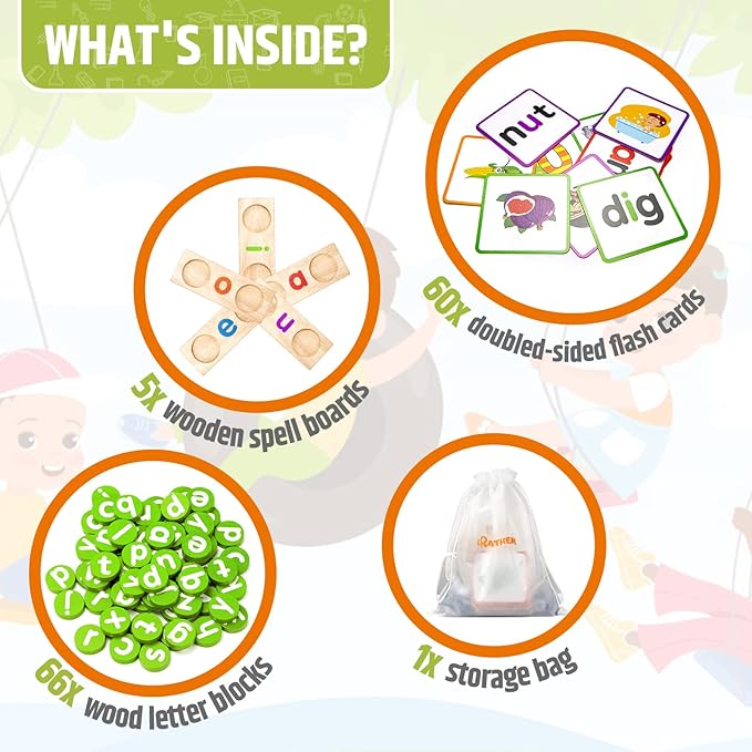 - 🥑【131-PIECE WODDEN SPELLING GAME】Comes with 66 pcs of wooden lowercase letter blocks, 60 CVC phonics word flashcards with picture illustrations, 5wooden spell boards in palm-size, and 1draw-string portable bag. More than 60 combinations of 3-letter-word, Fun learning toys for 3-5 year olds.
