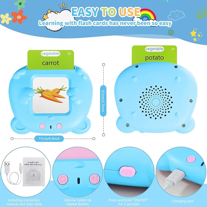 - 🏫【 Flash Cards For Toddlers 】This therapy toy set includes a card reader,112 double-sided flashcards and USB charging cable.This speech therapy toy includes a card reader and 112 double sided flash cards covering 12 subjects like shapes, colors, animals, daily necessities, transports, food, fruits, vegetables, costumes, nature, persons & jobs.
