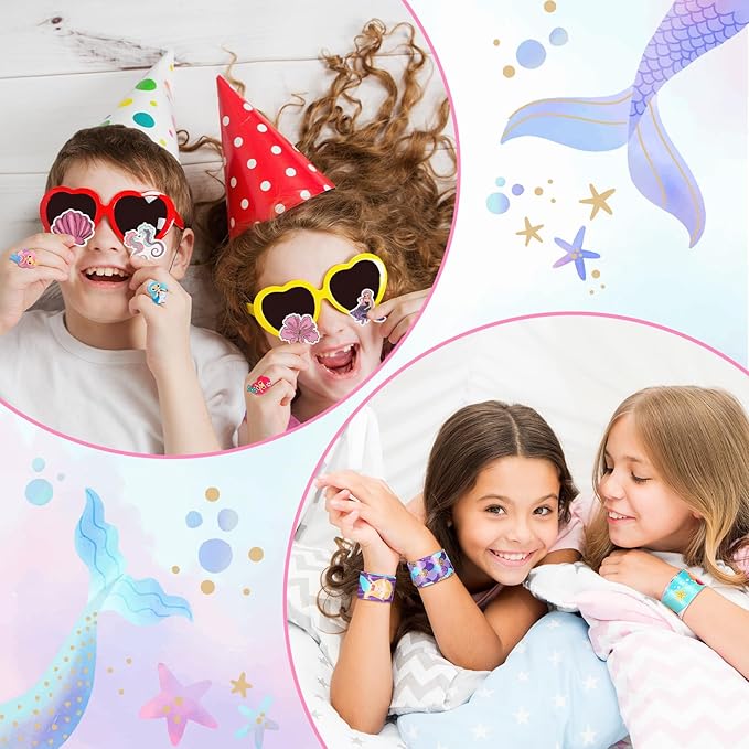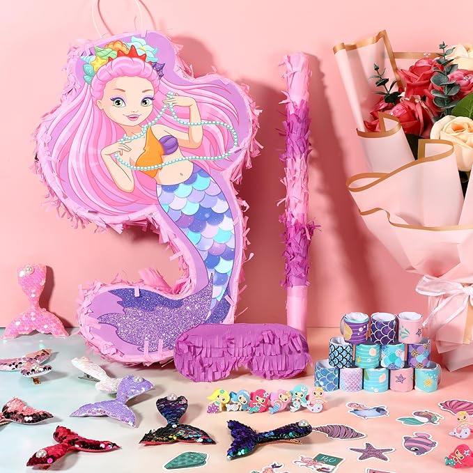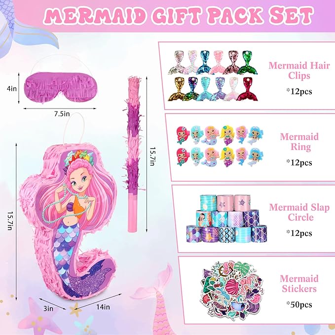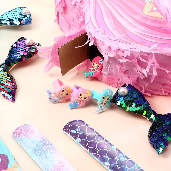 - Packing List: all mermaid goodie bags favors are equipped with 90 pieces colorful accessories that girls like, includes 1 pc mermaid piñata bundle with 1 pc blindfold, 1 pc bat and 1 bag confetti papers, 12 pcs mermaid rings, 12 pcs hairpins, 12 pcs slap bracelets and 50 pcs mermaid stickers, will be a great pack for kids mermaid birthday party supplies