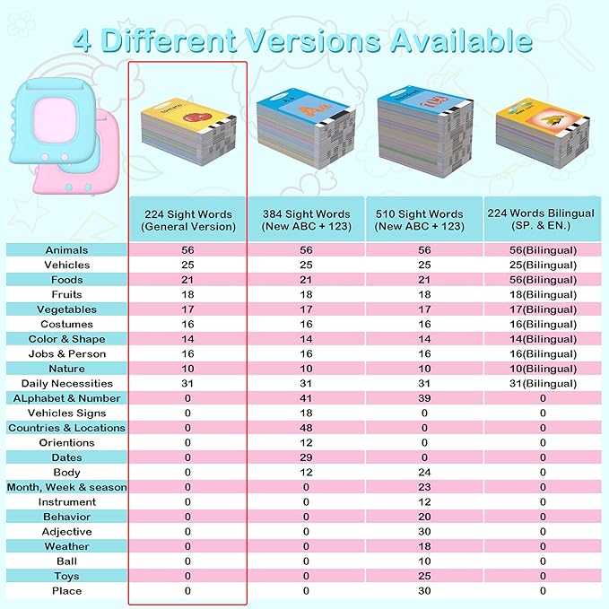 - 【Learning Toys for Toddlers 1-3】: Nibour talking flash cards for toddlers 1-3 include a cute card reader and 112 double-sided sight word flash cards that covering a lot of subjects, like colors, animals, daily necessities, vehicles, food... It's a montessori toy that more fun and instructional to help toddlers learning 224 basic words, deloping speech ability and early reading skills for future academic success.