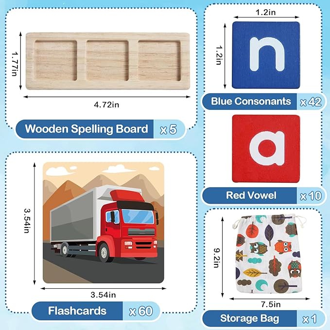 - Wooden CVC Word Flash Cards Set:The package comes with 60 double-sided phonics CVC flash cards, 5 wooden spelling boards, 52 wood letter blocks(10 pcs red vowels and 42 pcs blue consonants) and 1 storage bag to help kids develop a good habit of packing toys.The learning toy for 3 4 5 6 years old boys & girls provides not just words reading & spelling, more than fun for kids to create and explore!