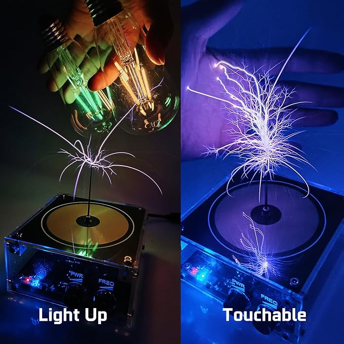 - IMPRESSIVE DESKTOP CONVERSATION STARTER ----- This Tesla coil model is not only a fascinating piece to display on your desk, but it also generates entertaining reactions from people when they witness it in action. Simply plug it in, and watch as the bulb illuminates, magical lightning, beautiful music, showcasing its mesmerizing functionality. Your guests will be intrigued and curious, making it an excellent icebreaker and conversation starter.