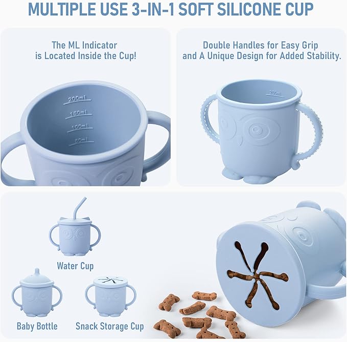 - Unique Designed Toddler Feeding Set: The baby spoon and fork in the infant weaning set are designed according to human mechanics, and the size is just suitable for babies aged 4 to 48 months; The matching silicone cup with 3 lids can not only serve as a baby bottle, also as a water cup and snack storage cup, babies can easily learn self-feeding skills using our silicone cup set.
