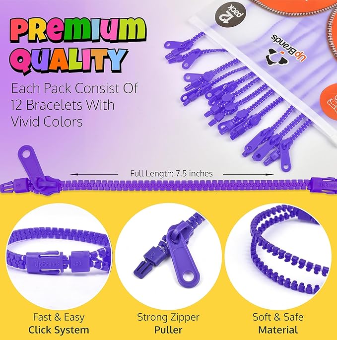- How many fidget toys come in the pack? The pack includes a total of 12 UpBrands purple zipper bracelets, each measuring 7 inches. These vibrant, single-color bracelets are perfect for sharing, group activities, or ensuring you always have a fun and practical sensory toy on hand. Their striking purple color and engaging design make them ideal for kids and adults alike, providing a playful and enjoyable sensory experience for everyone.
