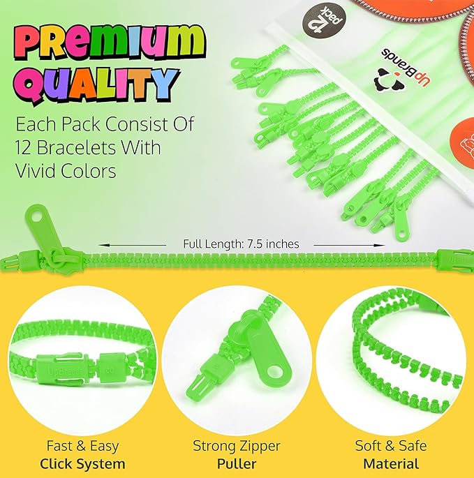 - How many fidget toys come in the pack? The pack includes a total of 12 UpBrands green zipper bracelets, each measuring 7 inches. These vibrant, single-color bracelets are perfect for sharing, group activities, or ensuring you always have a fun and practical sensory toy on hand. Their fresh green color and engaging design make them ideal for kids and adults alike, providing a playful and enjoyable sensory experience for everyone.