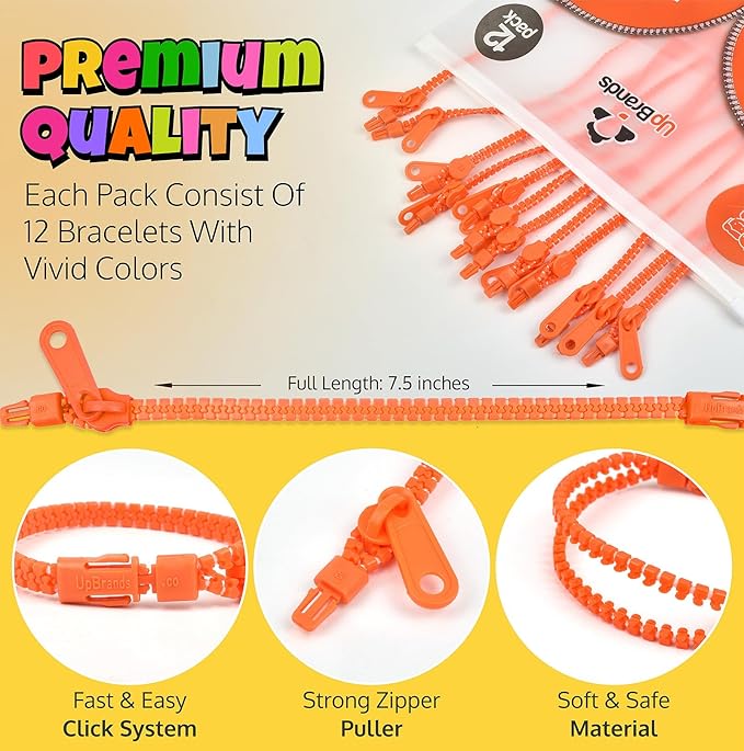 - What colors do these come in? Our 12-pack orange zipper bracelets come in a bold and energetic orange color. These bracelets provide a fun and engaging sensory experience, ideal for sharing, group activities, or personal use. The lively orange color adds a vibrant and playful element, perfect for all ages.