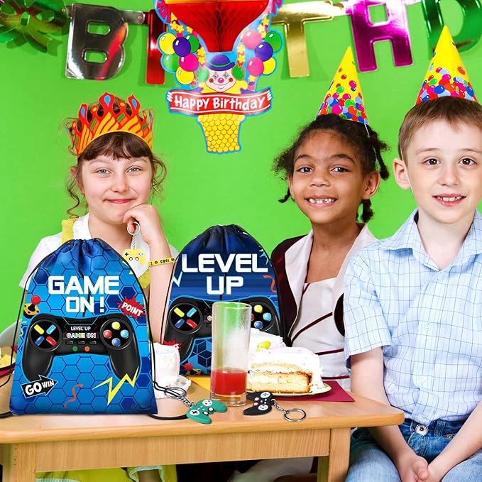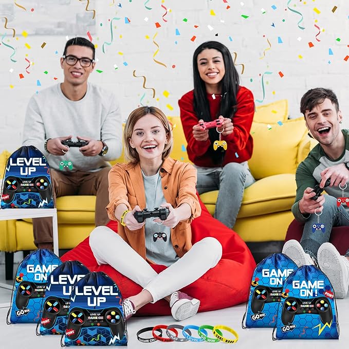 Nosiny 72PCS Video Game Party Favors Birthday Include 24 Video Game Goodie Drawstring Bags 24 Silicone Bracelet 24 Controller Keychain for Kids for Party Supplies(Fresh, Blue)