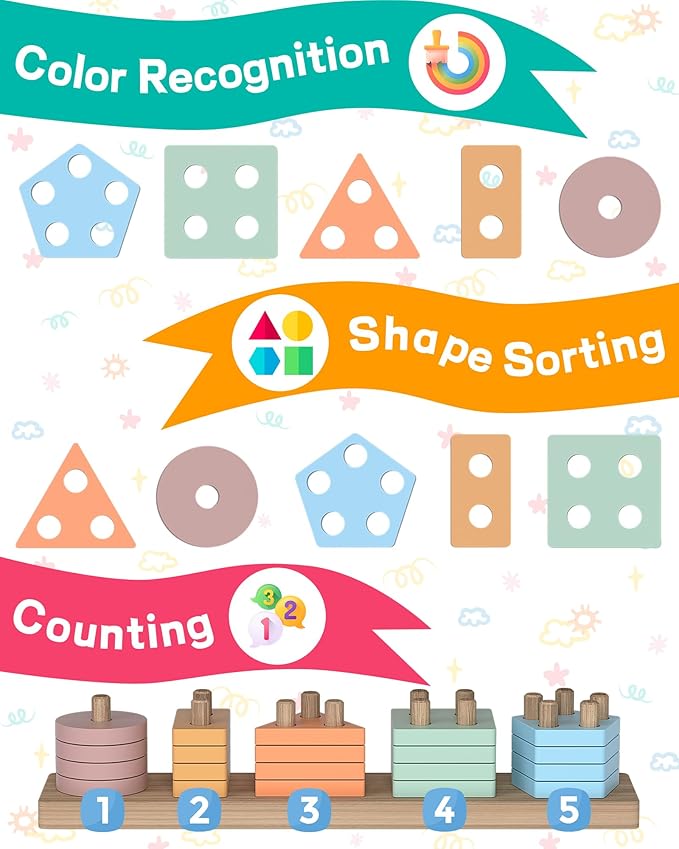 - 【Montessori Toys for Toddlers】This wooden sorting & stacking toy contains 20 pieces, including 5 geometric shapes-circular, rectangle, triangle, square, and pentagon with 5 colors-red, orange, yellow, green, and blue. It’s the perfect educational toy for 1 2 3 year old children, which helps kids learn shapes and geometry, build color recognition, and exercise space conception. When babies try to match the blocks to the target or make various combinations, they can also get so much pleasure.