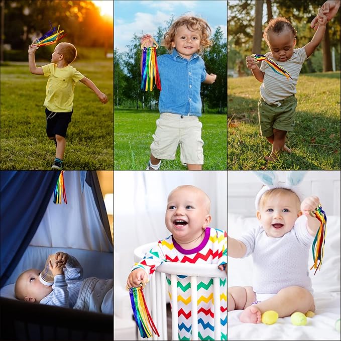 - ★ Soft ribbons and bright colors can stimulate your baby's visual abilities during play, helping them exercise their observation and coordination skills earlier. The bell attached to the bracelet will emit a crisp and pleasant "Jingle Bell... Jingle bells..." sounds, which can attract your baby's attention and help them exercise their hearing and reaction skills earlier.
