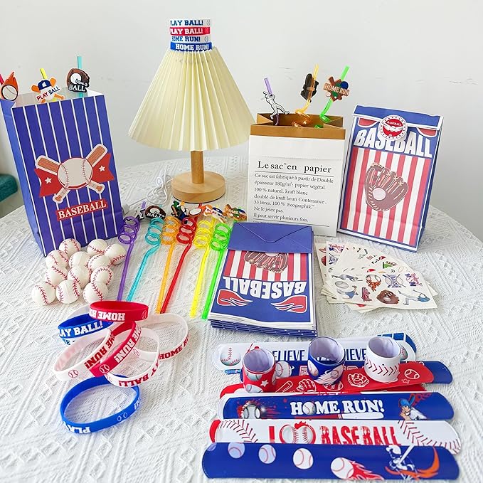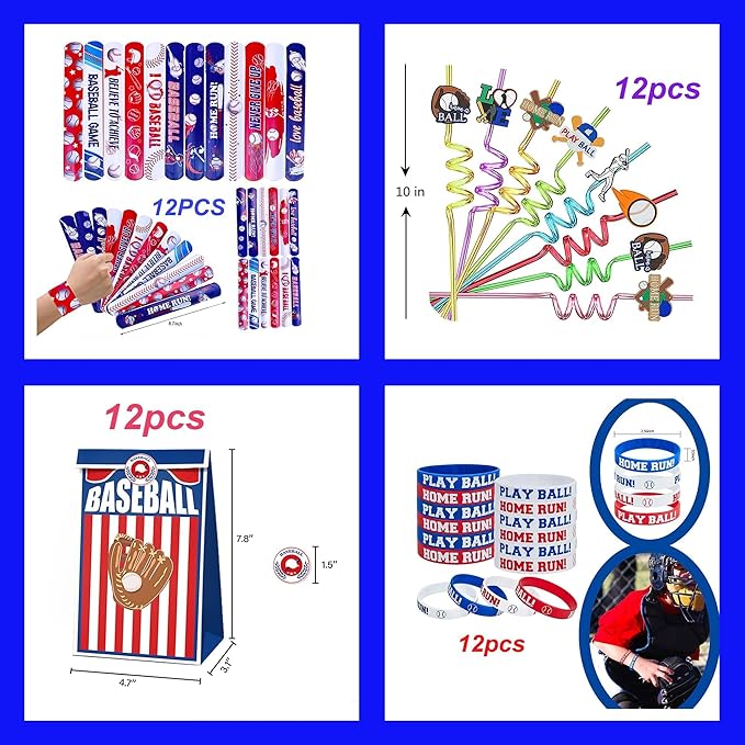 - PACKAGE - Baseball party favors Include 12 baseball present bags, 12 baseball slap bracelets, 12 baseball silicone bracelets, 12 baseball straws, 12 tattoo stickers, 12 mini baseballs, total 72 pieces baseball party favors, will be great for kids party favors.