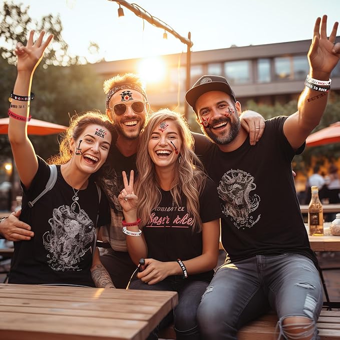 - Rock N Roll Party Favors - This package includes 12pcs rock silicone bracelets(4 styles) and 24pcs temporary tattoos(12 styles), which are totally suitable for rock and roll party, music festival and the rock band show.