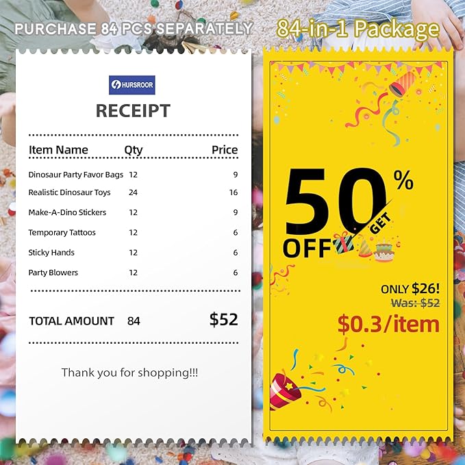 - MAKE PARTY PLANNING EASY - Easy for parents or teachers to prepare and hand out party favors for 12 kids. This value pack contains: 12 gift bags, 24 realistic dinosaur toys, 12 temporary tattoos, 12 make-a-dino stickers, 12 sticky hands and 12 party blowers. Totally 84 pcs. Absolutely unforgettable surprises for kids! Buy more if it's a big party!