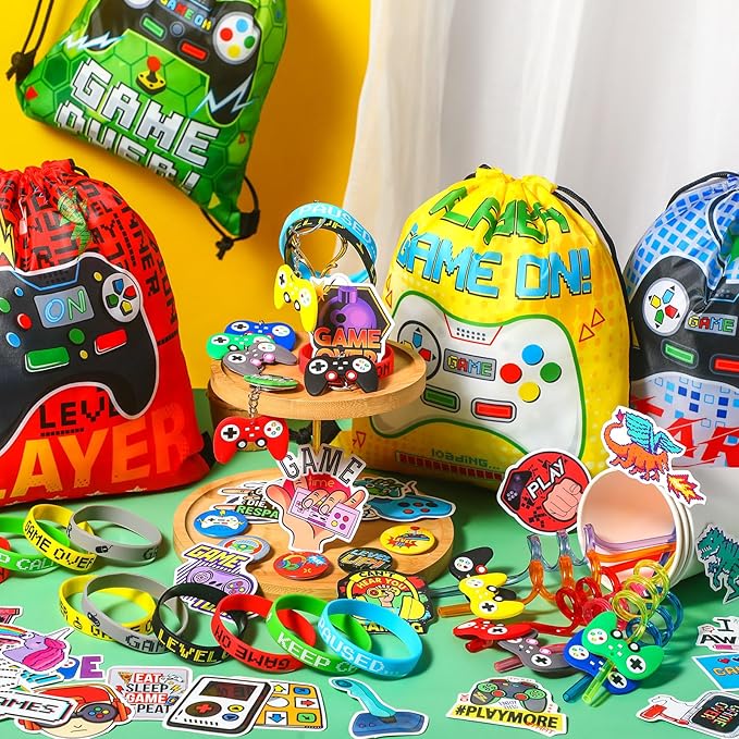 - Bring Fun to Birthday Parties: these gamer party favor bags are perfect for storing party favors, toys, and other items; The drinking straws are great for party favors in the goodie bags, or for everyday use; The silicone wristbands and keychains are flexible and suitable for both children and adults; Pins and stickers come in a variety of colors to match your personal style, perfect gamer birthday surprise