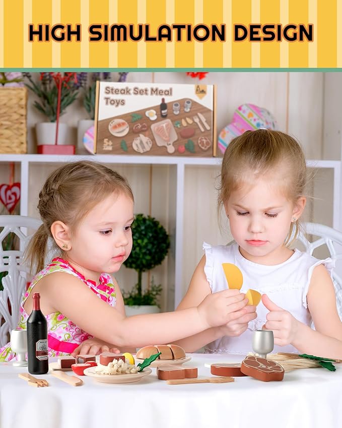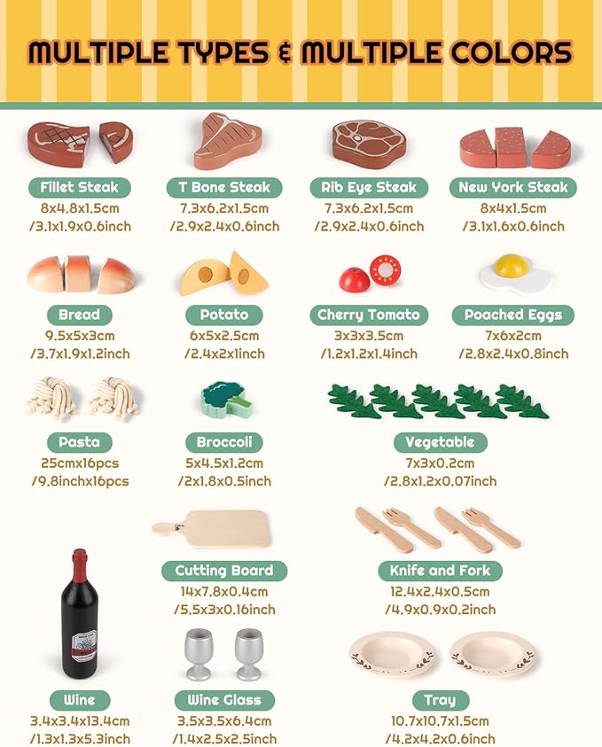 - 【 UNIQUE PRETEND PLAY 】These kids kitchen accessories include all the needed for the restaurant theme, such as different types of steaks, pasta, and even wine. It's a bold idea, but don't worry, the kids won't be able to taste the wine.