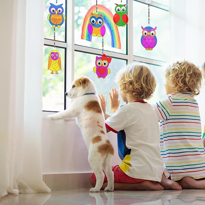 - Quantity: 27 sets owl suncatchers DIY window paint art suncatchers craft kits include 27 pcs owl sun catchers in 9 designs, each design has 3 pcs. 20 bottles of 7 rainbow colors suncatcher paints (6ml per bottle), 1 strip of 8 empty paint pots, 27 pcs paintbrushes, 324 pcs rainbow acrylic beads, 1 roll of 393" long fishing thread, 27 pcs suction hooks. Each suncatcher has a hole at the top for hanging. This fun art project is perfect for kids and adults.