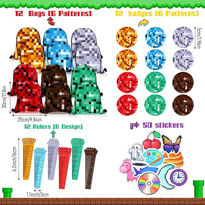 - Assorted Pixel Party Favors: this set of Pixelated party decorations contains 12 pixel drawstring bags, 18 spiral notebooks, 12 badge buttons, 12 silicone bracelets, 24 bookmarks, 12 pixel pencils, 50 stickers in 1 pack, and 12 pixel keychains, a sufficient quantity and diverse styles to gift your guests; This complete set will save you time and effort, helping you hold a wonderful party