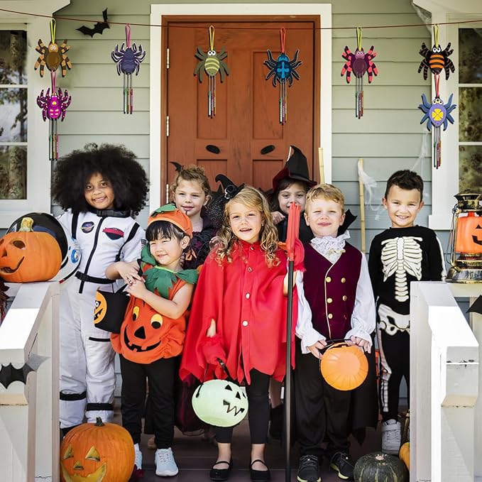 - Craft Project For Kids:Paint your favorite color on the unfinished wooden spider ,and then go through the holes of wood chips and chime rods with a rope,and you will get a unique wind chime.These wooden chimes for outside will sway with the wind and made a joyful sound. Hanging wind chimes in the windows, doors and walls which emit more energy,a easy way to adding a terror Halloween atmospher .