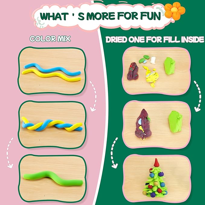 - Mess-Free Fun: Our clay is designed to be non-sticky to hands, making it easy to shape and stretch without leaving a mess behind. It's light and soft, perfect for little hands to mold with ease.