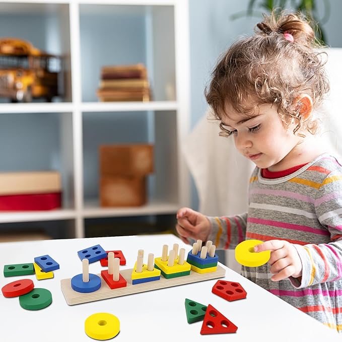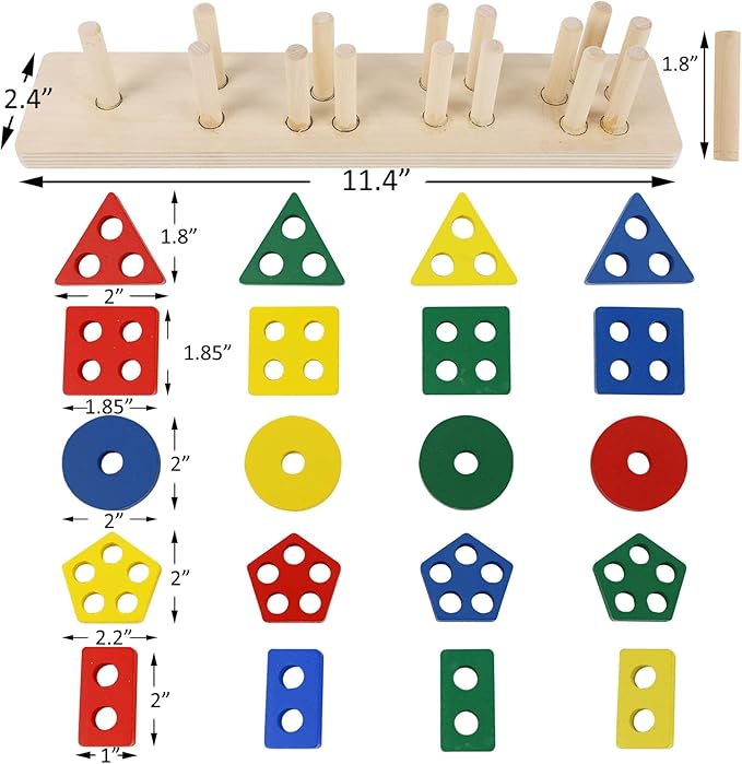 - WOODEN MONTESSORI STACKING TOYS: The small board is a simpler educational toys, this wooden stacking puzzle contains 20 pieces including blocks of 4 different colors and 5 geometric shapes, kids need to stack on matching pegs. This set is designed to help children develop their cognitive skills, hand-eye coordination, color recognition, and shape understanding