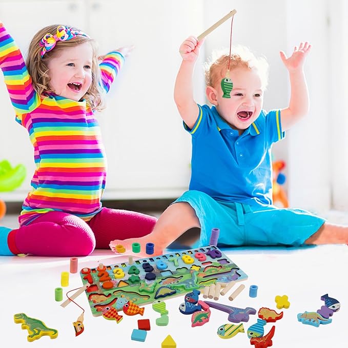 - WOODEN MAGNETIC FISHING GAME: The large board comes with 2 wooden fishing rods with a magnetic hook, and various colorful and cute sea fishes made out of wood with little magnets attached. Your litter one need to carefully lower the line and get the rod's magnet to connect with the one on the fish. This Montessori game can help with color and shape recognition and even spur imaginative play when children make up stories about the creatures they catch