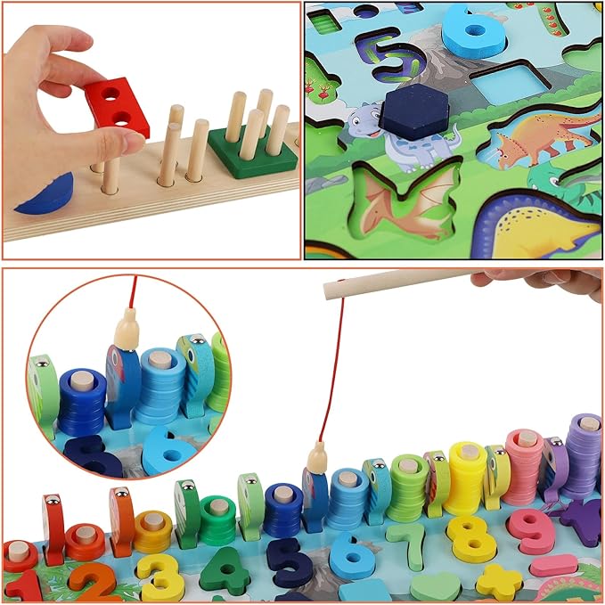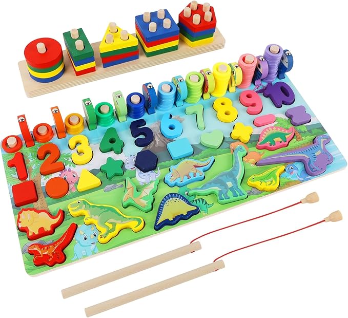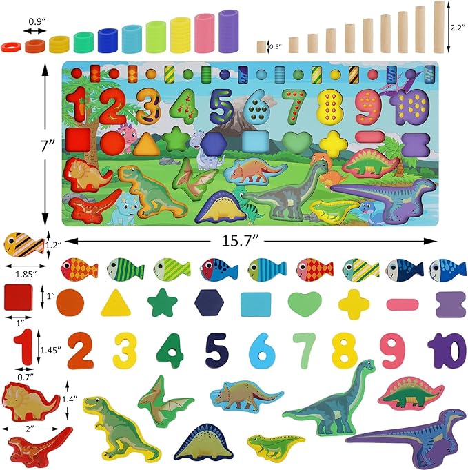 - VARIOUS WOODEN MONTESSORI PUZZLES: A large board Montessori sorting toy contains 1 board with 10 attached pegs, 50 rings with 10 different colors, 2 wooden fishing rods with a magnetic and 10 different color fishes, 10 different wooden shapes, 10 colorful wooden numbers, 10 different kinds of dinosaurs, is a great educational toy that can entertain kids and toddlers for hours. Children can practice sorting and stacking the shapes according to size, color, or pattern