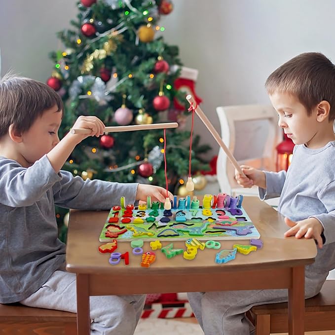 Glintoper Christmas Wooden Gift for Toddlers, Number Puzzle & Sorting and Stacking Toys Set for Kids 2 3 4 5, Montessori Magnetic Fishing Game, Shape Sorter Color Stacker Preschool Activities Gifts