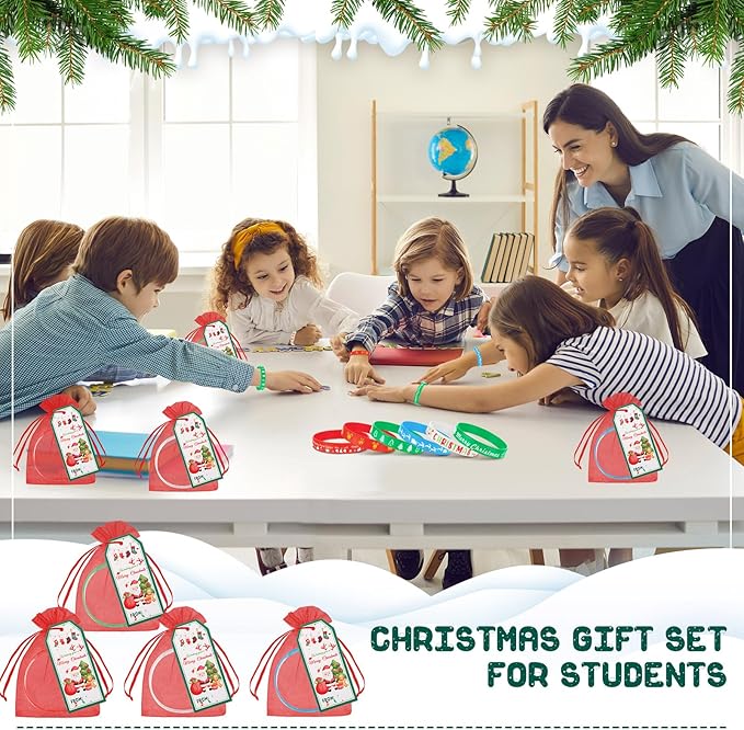 - Size Information: Christmas silicone wristbands are approx. 2.56 inches in diameter; And the size of the gift cards is about 1.57 x 3.54 inches/ 4 x 9 cm and mesh organza bags are approx. 3.94 x 4.72 inches/ 10 x 12 cm