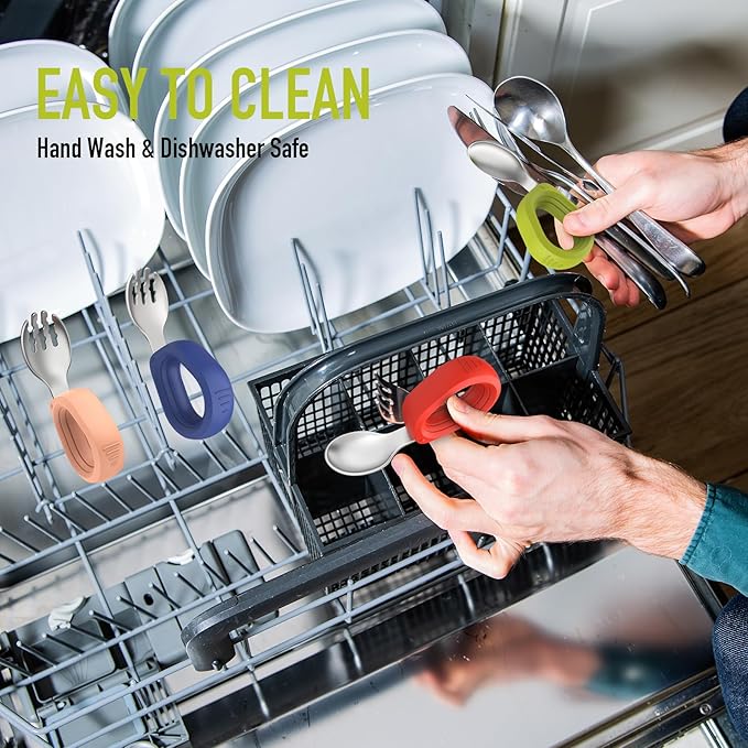 - [Good Materials that Parents Want] The whole body of the toddler fork and spoon is made of high-quality stainless steel and silicone. The stainless steel fork and spoon heads are strong and resistant to wear and tear. Silicone handle, flexible and elastic to hold, not easy to slip, not afraid of biting.