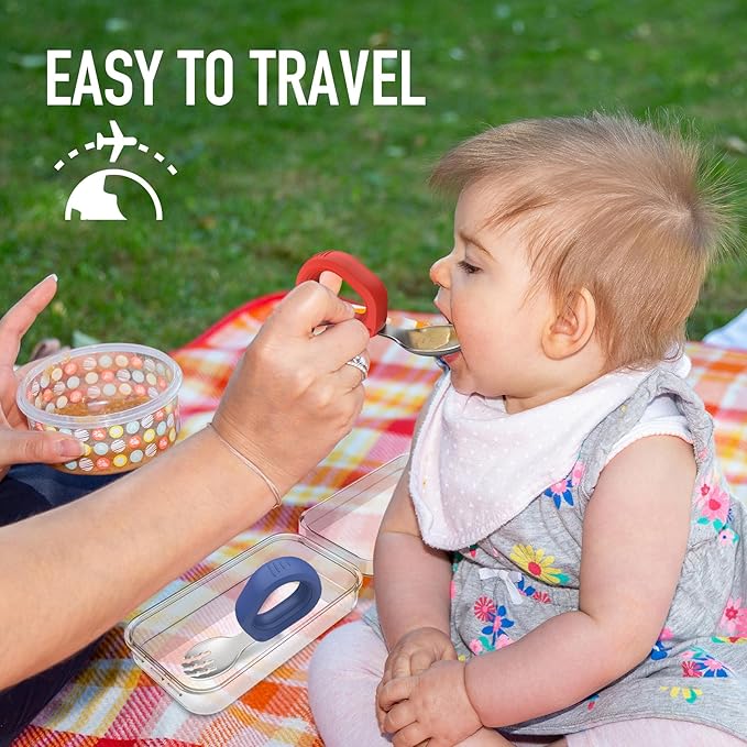 - [Hollow handle design for stable grip] The baby Utensil has a hollow ring handle that fits where a baby makes a fist. It's made of flexible food-grade silicone that's safe to chew, and when eating, baby can grab the soft handle with one hand or put a finger into the loop, making it easy for baby to eat.