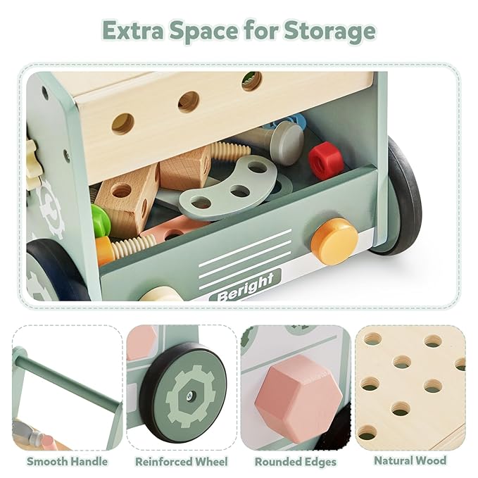 Beright Wooden Baby Push Walker, Wooden Baby Walker and Tool Toy for Toddlers, Kids Tool Bench, Baby Activity Center, Toddler Montessori Educational Toys, Green