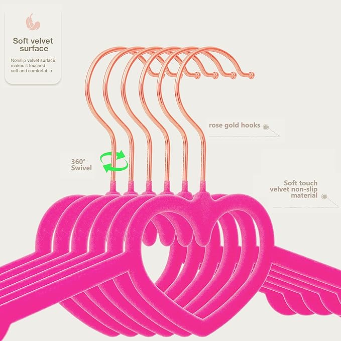 Kids Velvet Hangers 50 Pack, 12.8 Inch Non Slip Childrens Hangers, 360° Swivel Rose Gold Hook, Ultra Thin Space Saving Toddler Hangers - Baby Hangers for Closet (Hot Pink)